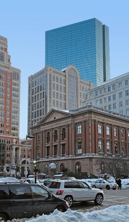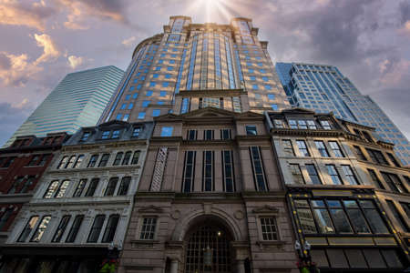 USA, Scenic Boston downtown financial district city skyline and skyscrapers.