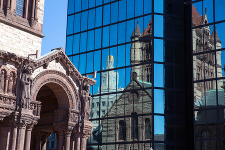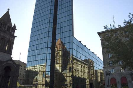 Reflections of the 19th century romanesque Trinity Church in the windows of the blue Hancock tower, Boston,Massachusetts