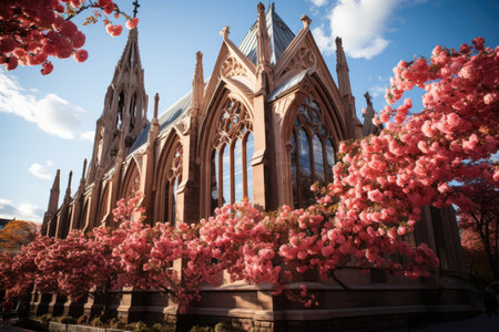 Imposing Gothic Church with stained glass and serene garden., generative AI
