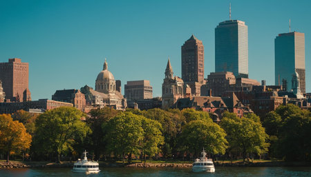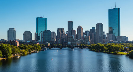A panoramic view of the Boston skyline featuring modern skyscrapers and historic buildings, with boats on the Charles River under a clear blue sky.