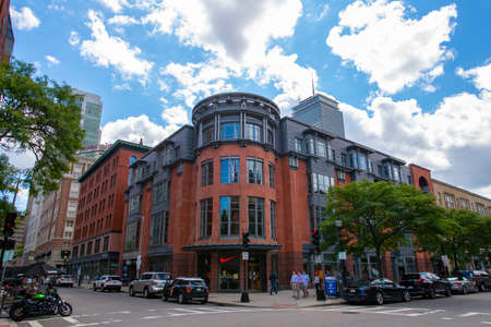 Historic Nike Store on 200 Newbury Street at Exeter Street with Prudential Center at the background in Back Bay, Boston, Massachusetts MA, USA.