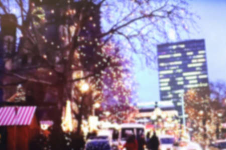 Conceptual defocused abstract decorated christmas tree and crowd of people on city street at night