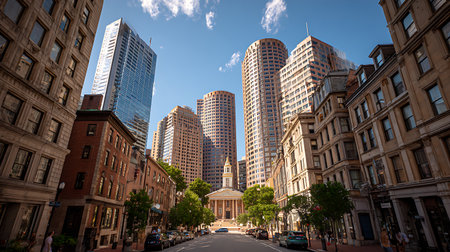 A street in Boston looking towards a classical building with a dome, framed by a mix of historic and modern skyscrapers. Sunlight illuminates the scene, highlighting the architectural details of the buildings. Cars are parked along the street, and trees provide greenery.