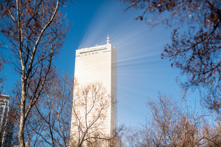 Sunlight reflecting from the gold-tinted glass of the 63 Square building skyscraper on Yeouido island in Seoul, South Korea on 1 January 2023