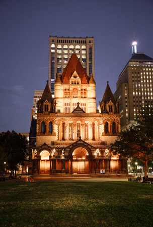 Historic Trinity Church in Boston Massachusetts seen in the evening with the John Hancock Tower visible in the background