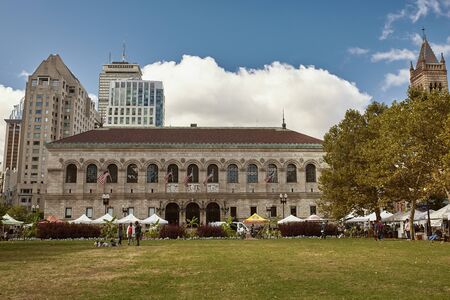 Boston, Massachusetts - October 3rd, 2019: Boston Public Library viewed from the distance in Copley Square in the Back Bay neighborhood