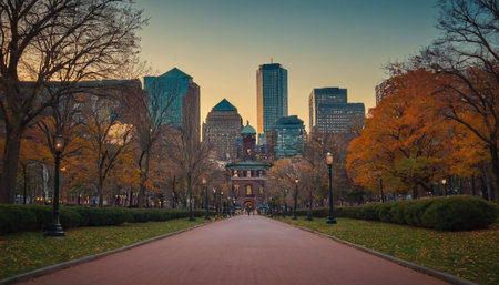A wide pathway through Boston Public Garden in autumn, surrounded by colorful foliage, leading towards the city skyline.