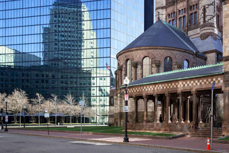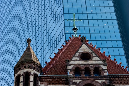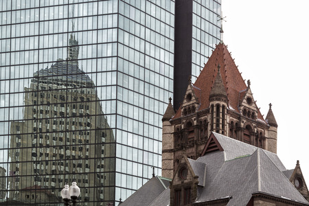 Reflections of the 19th century romanesque Trinity Church in the windows of the blue Hancock tower, Boston,Massachusetts