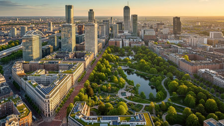 Skyline showing aerial view of a modern city skyline with a lush green park and a serene pond. resolution