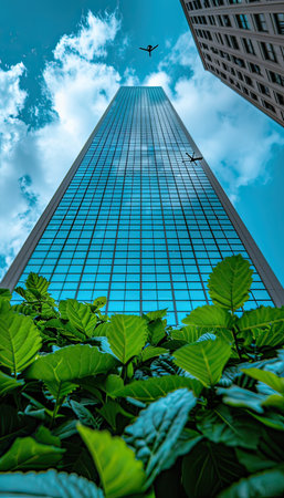 A low angle shot of a beautiful and modern skyscraper with windows under the blue sky