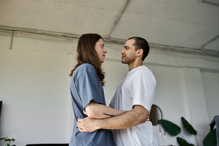 A young gay couple embraces in a bedroom, expressing their love for one another.