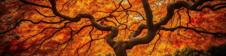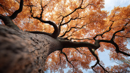 Low angle view of a majestic tree with vibrant orange and red autumn leaves, its branches reaching towards the sky on a beautiful fall day, creating a stunning natural spectacle