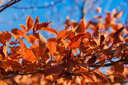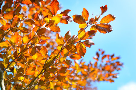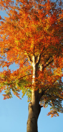 Golden young beech tree against clear blue sky on a sunny day. Close-up of colorful red, orange, yellow leaves. Natural pattern, texture, background. Early autumn. Seasons, climate change, environment
