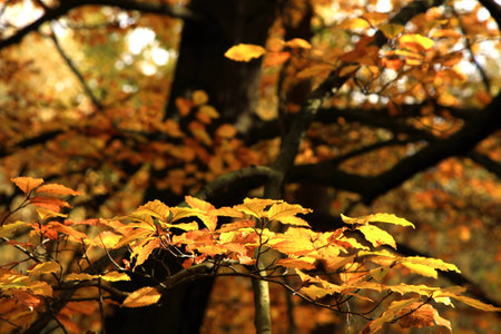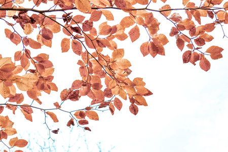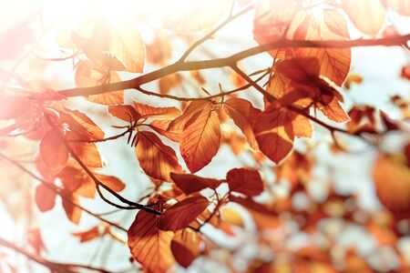 Colorful beech leaves on thin twigs, autumn day.