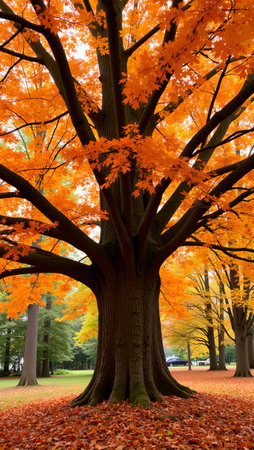 Vibrant sugar maple tree with wide orange canopy and textured trunk in autumn setting