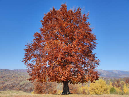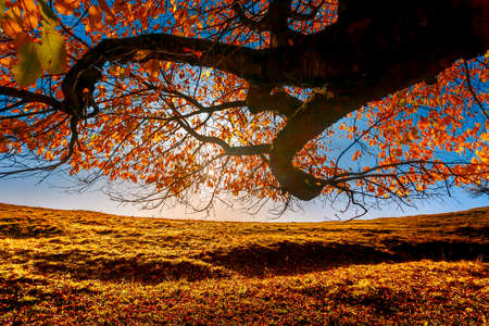 Autumn. A large mighty tree stands on top of the mountain, spreading its branches in different directions. The Carpathians. Selective focus, defocus