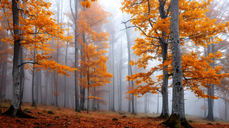 Orange and yellow leaves shining through the fog in an autumn forest