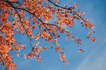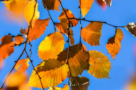 Vibrant autumn leaves on tree branch contrasted against clear blue sky background in sunny weather