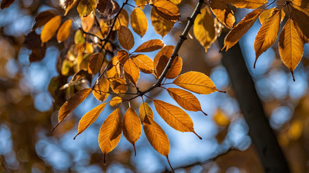 Sunlit leaves on a branch display their warm fall colors against a sky backdrop, ideal for seasonal designs and nature themes.