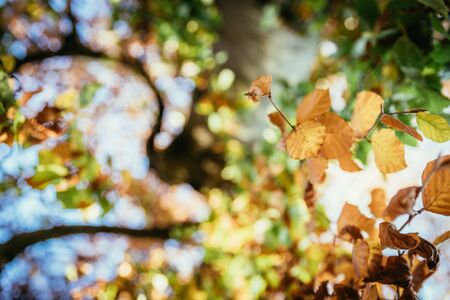 Colorful leaves on a tree in autumn, park flair and blurry background