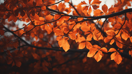 Vibrant orange and red leaves on a tree branch, gently swaying in the autumn breeze, a perfect representation of the fall season.
