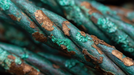 Closeup view of copper wire strands showing green patina corrosion developing on the surface with textured oxidation patterns forming naturally.