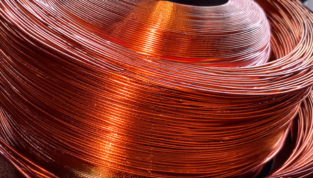 A close-up of gleaming copper strands entwined, their warm golden reflections capturing light against a textured industrial surface, evoking energy and craftsmanship