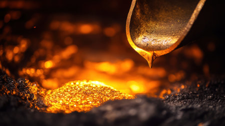 A close-up view of molten metal flowing from a furnace spout, showcasing an intense orange glow against a dramatic dark background, highlighting industrial processes.