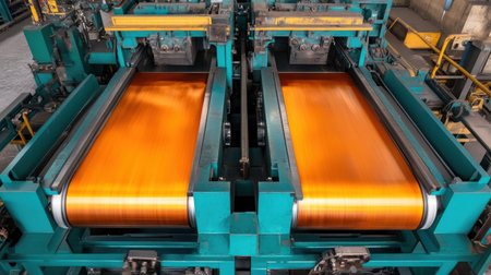 This image showcases the intricate manufacturing process of copper sheets, featuring vibrant orange colors and advanced machinery in an industrial environment.