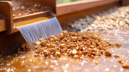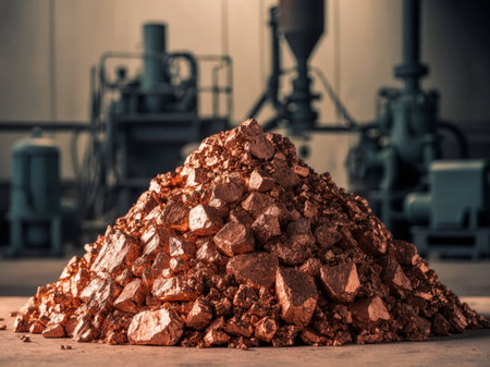 AI Generated. Shimmering Raw Copper Ore Pile with Uneven Mound and Machinery in Background