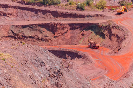 close up of open cast mine extracting iron ore with heavy trucks, excavators, diggers and locomotives
