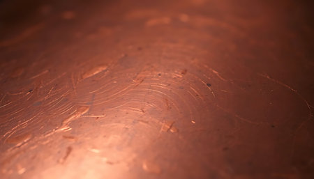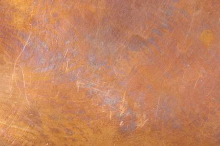 A close-up view of a copper surface with various scratches and subtle color variations, showing its natural texture and metallic sheen.