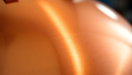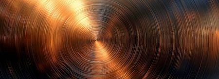 A detailed close-up shows a textured copper surface. Light reflects across the metal, creating a warm, polished appearance. The lines and gradients add depth to the abstract design. It feels smooth and metallic.