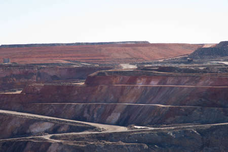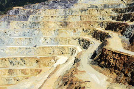 close up of open cast mine extracting iron ore with heavy trucks, excavators, diggers and locomotives