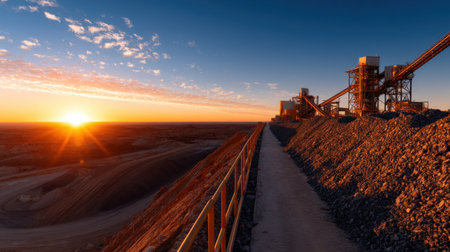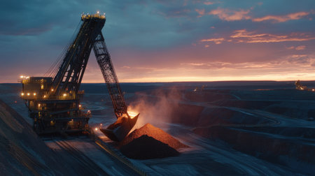 A dramatic view of heavy machinery loading minerals in an open pit mine during sunset, showcasing industrial activity and natural beauty.