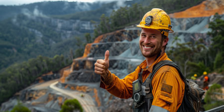 A joyful miner with a thumbs-up celebrates progress in front of an expansive mining operation under cloudy skies.