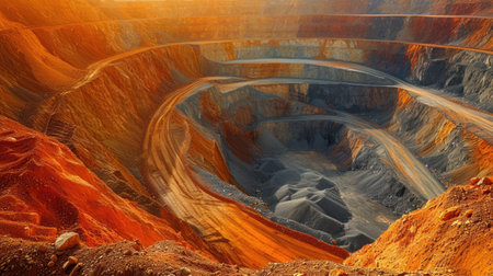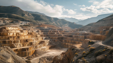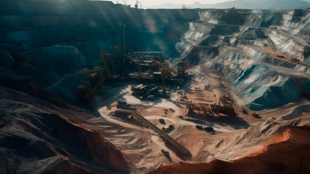 Vast Open Pit Mine Showcasing Heavy Machinery at Work in a Mineral Rich Landscape During Daylight Hours. Generative AI