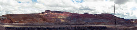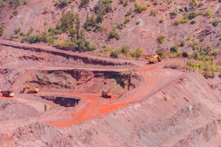 open cast mine extracting iron ore with heavy trucks, excavators, diggers and locomotives