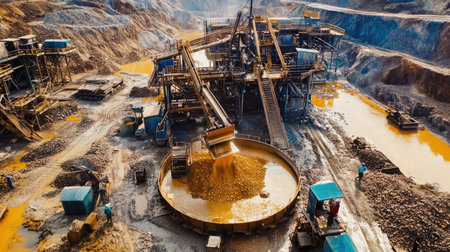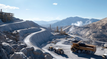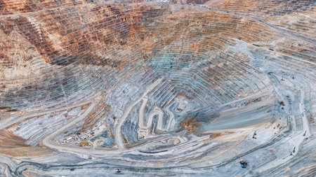 Aerial perspective of a large mining operation at a quarry. Heavy machinery works to extract minerals from the earth, while workers oversee the process.