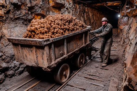 A dedicated miner pushes a heavy cart filled with ore along worn tracks deep within a dimly lit underground tunnel, showing the effort and determination involved in mining.