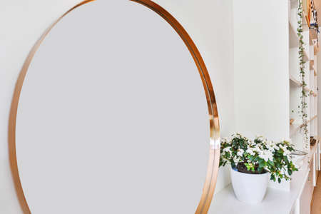 Stylish scanidnavian interior with wooden desk, design gold accessories, books and plants. Beautiful mirror on the white wall. Creative desk of home decor. Warm and sunny room. Copy space. Real photo.