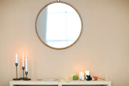 Small makeup mirror on the table, selective focus