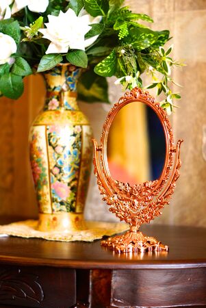 baroque style mirror on wood table,shallow focus