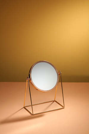 Gold mirror on beige background. Vanity table concept. Minimal composition.