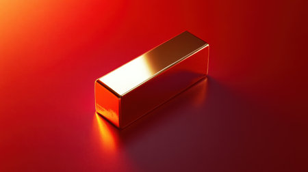 A stunning shiny gold bar rests on a smooth red surface, illuminated by warm light, creating an elegant and luxurious atmosphere perfect for representing wealth and opulence.