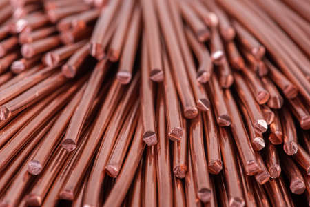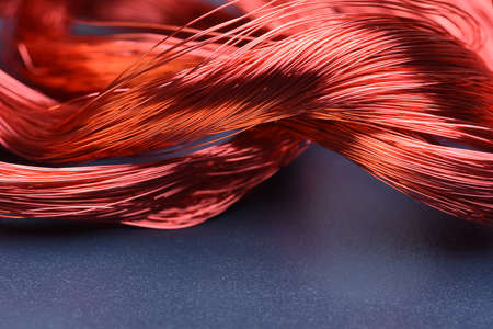Copper wire for electronics close-up with a focus on the center and blurred edges of the right and left. Designed for the production of electronic components in the electrical industry.