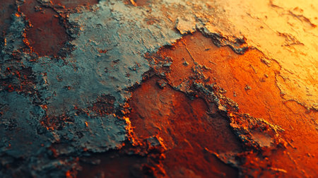 Detailed close-up of a weathered metal surface with rust and peeling paint, revealing textured layers in warm lighting.