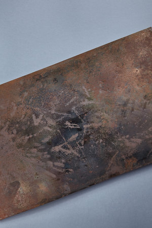 The surface of copper shows faint traces of its original golden sheen now faded and speckled with textured marks and discoloration