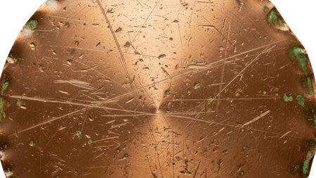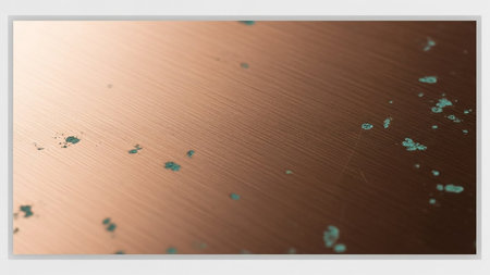 Close-up of a brushed copper surface with green patina spots and fine linear texture