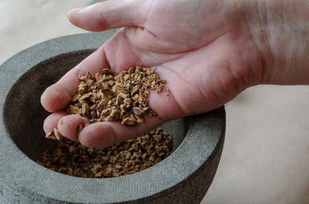 The hand of an adult Caucasian male demonstrates crushed random medicinal roots and herbs in a stone mortar. A mixture of dried herbs for the treatment of various diseases. Alternative medicine. Selective focus.